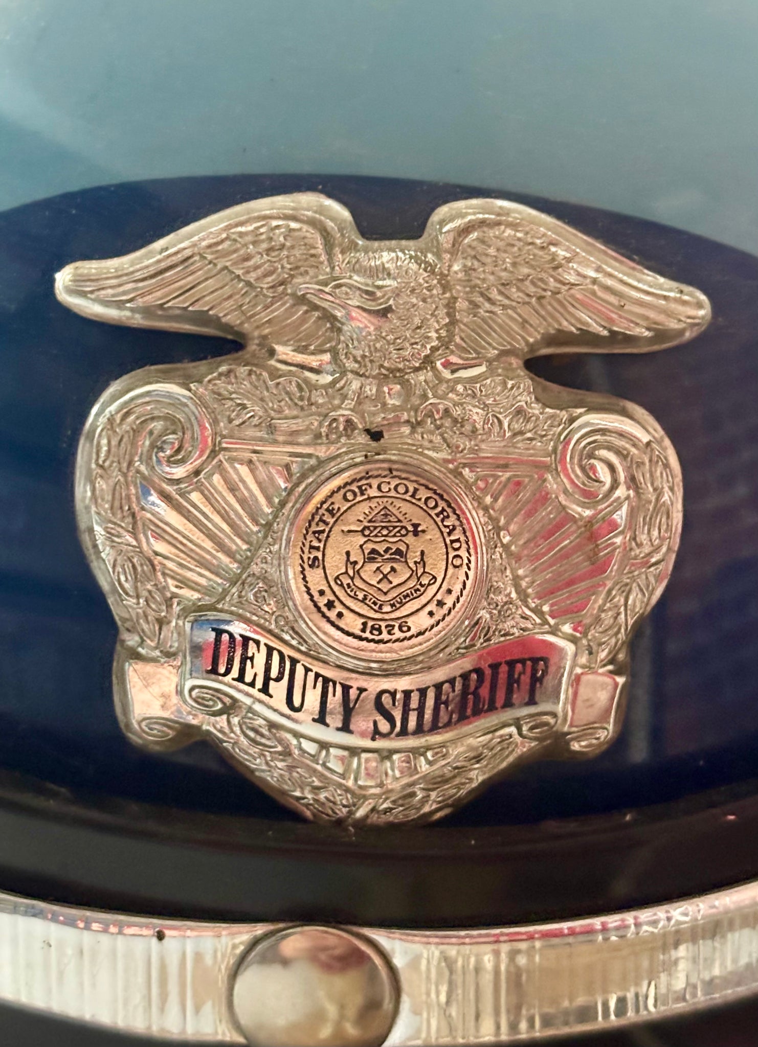 Un Petit Bout d’Amérique vous propose aujourd’hui une pièce absolument mythique de la culture américaine : vous avez sous les yeux un véritable casque de moto de Sheriff américain en provenance directe du Colorado !
