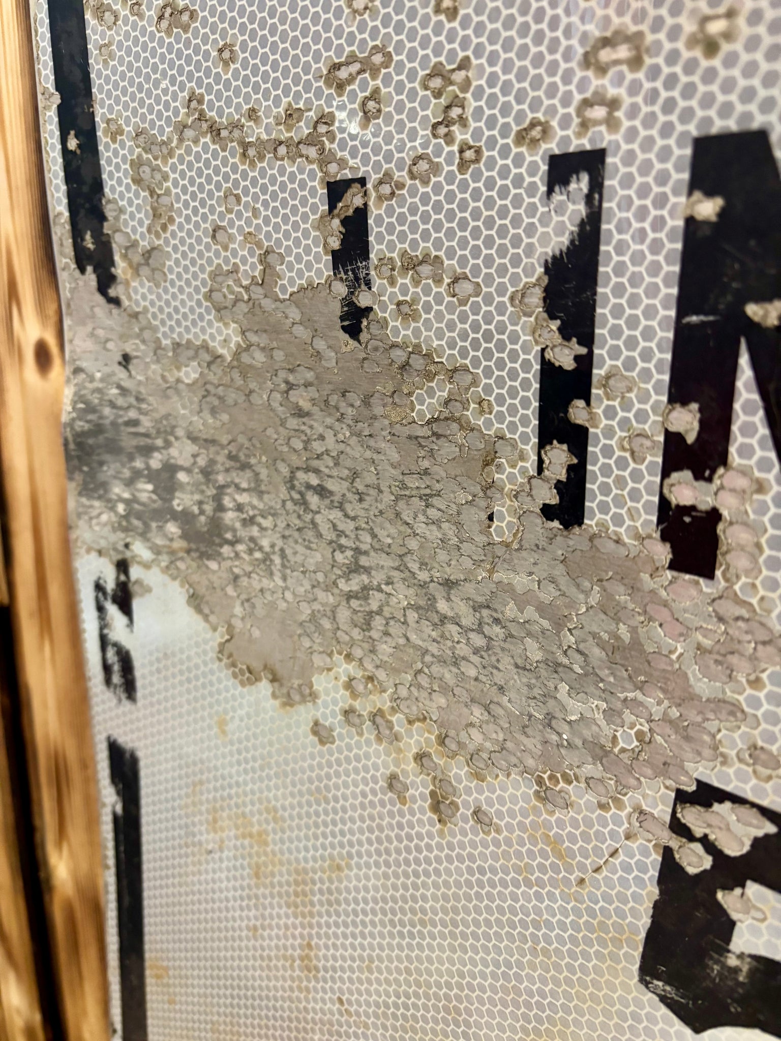 Ce panneau a été CRIBLÉ DE BALLES, VISIBLEMENT DE PLOMBS