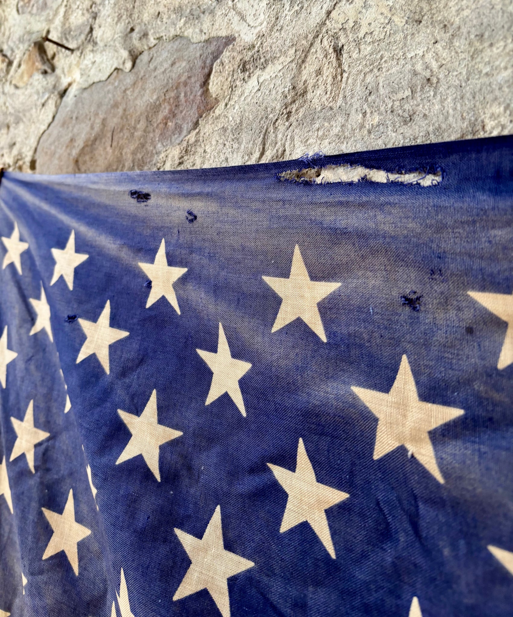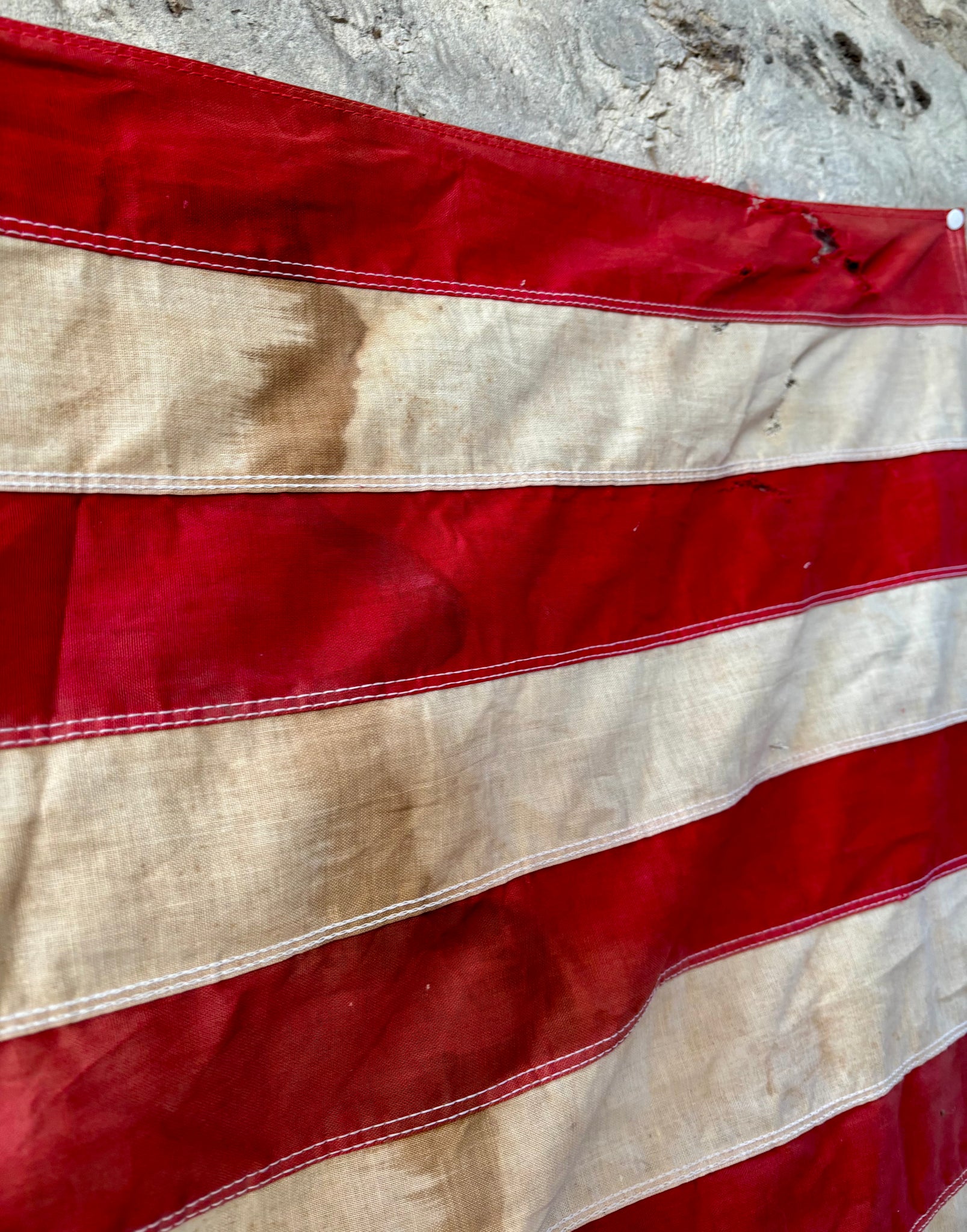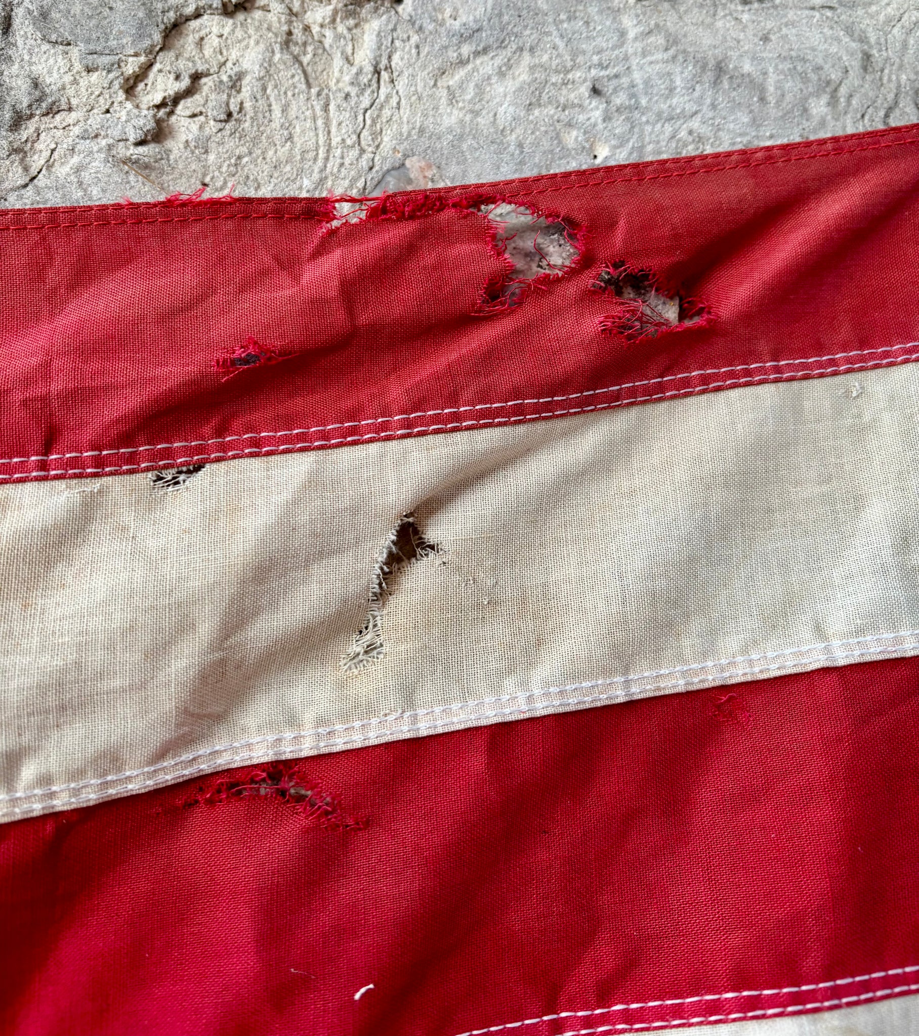 Ce drapeau, en coton, a passé toute sa vie à l’extérieur, à flotté dans l’Ouest Américain, et ça se voit.