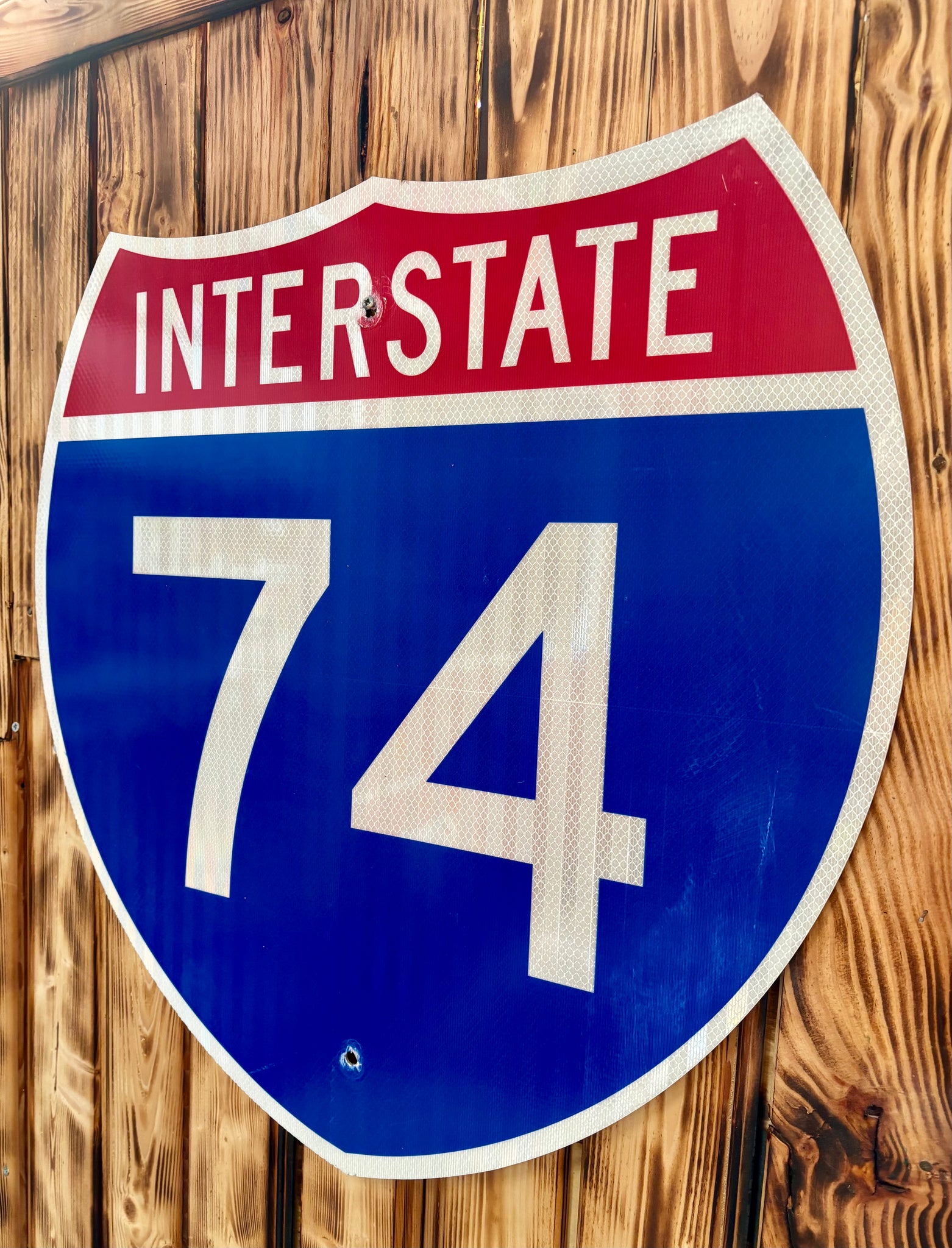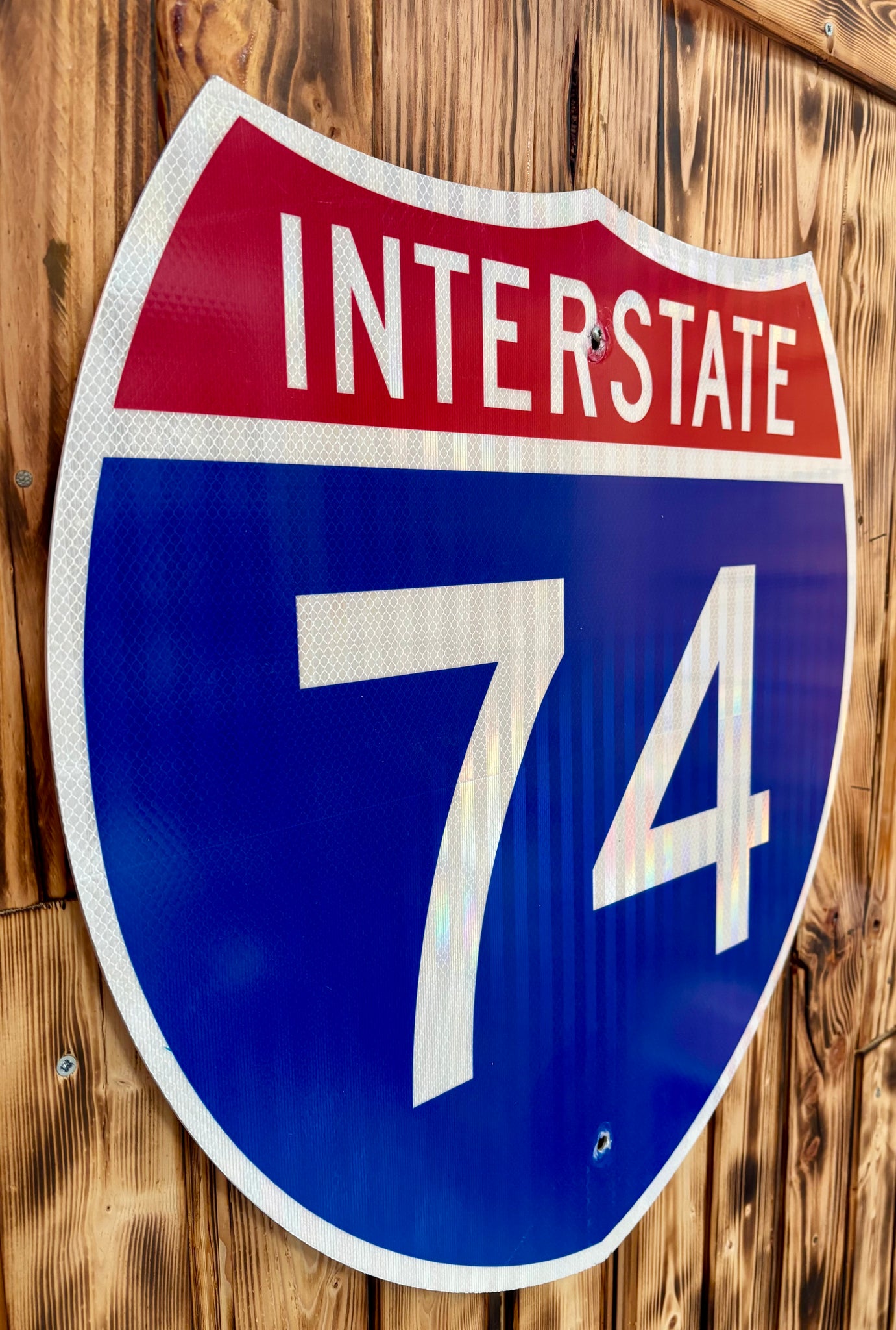 Véritable panneau routier américain de l’Interstate 74 mesurant 61x61cm en provenance directe de l‘Indiana !